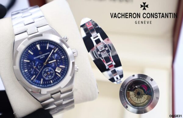 The Vacheron Constantin Overseas watch features a 41mm case, offering a blend of sporty elegance crafted entirely from stainless steel, adding a touch of durability and luxury. The iconic bezel, designed with eight sides, draws inspiration from refined geometric designs, while the dial features luminous hands and prominent hour markers for easy time reading.