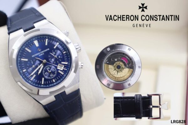 The Vacheron Constantin Overseas watch features a 41mm case, offering a blend of sporty elegance crafted entirely from stainless steel, adding a touch of durability and luxury. The iconic bezel, designed with eight sides, draws inspiration from refined geometric designs, while the dial features luminous hands and prominent hour markers for easy time reading.