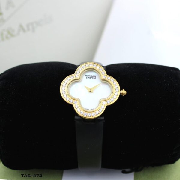 This watch is a symbol of luxury and elegance, featuring a premium leather strap with a buckle engraved with the iconic Van Cleef logo, reflecting high-quality design and craftsmanship.