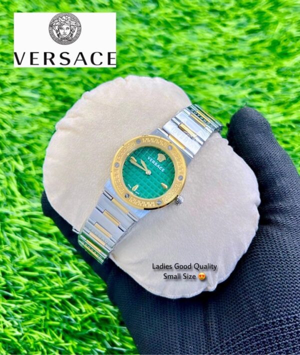 The Versace watch is a REPLICA featuring distinctive engravings and stands out as a luxurious piece for women. The watch has a silver metal strap, with the Versace logo prominently displayed at the top of the dial. It has a small size, measuring 31mm, making it perfect for women. The watch comes with all accessories, is water-resistant, and includes a one-year warranty.