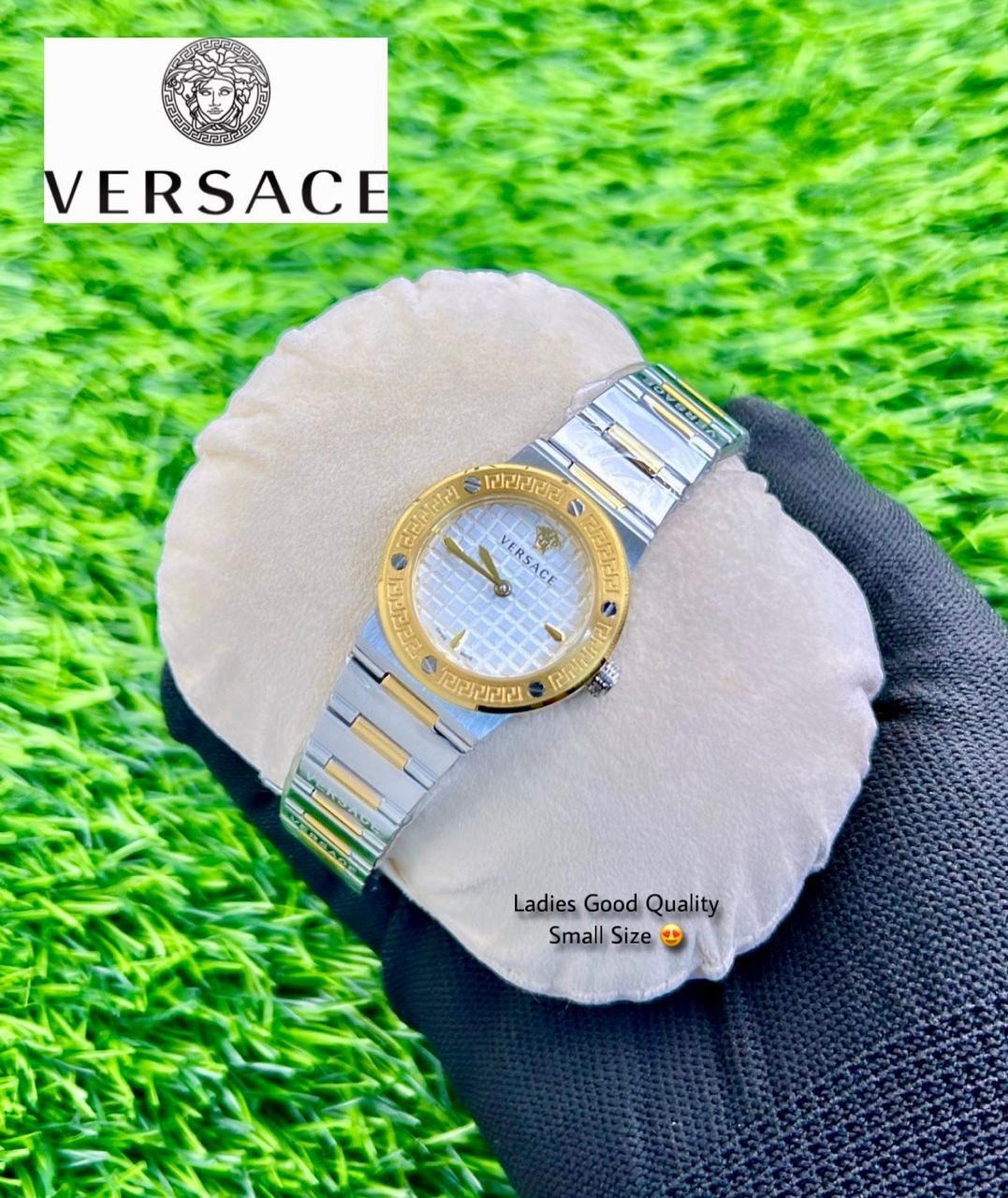 The Versace watch is a REPLICA featuring distinctive engravings and stands out as a luxurious piece for women. The watch has a silver metal strap, with the Versace logo prominently displayed at the top of the dial. It has a small size, measuring 31mm, making it perfect for women. The watch comes with all accessories, is water-resistant, and includes a one-year warranty.