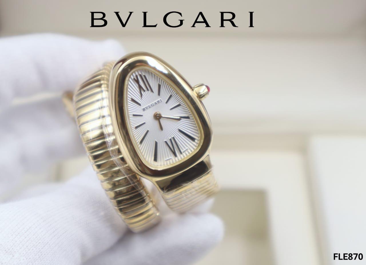 The Serpenti Tubogas watch by Bulgari, with a 33mm size, combines elegance and allure, reflecting the strength and beauty symbolized by its snake-inspired design. The strap is made from durable Stainless Steel 900 and features a distinctive shine that adds a touch of luxury. It is equipped with Sapphire glass that resists scratches and is also water-resistant, making it ideal for any occasion.