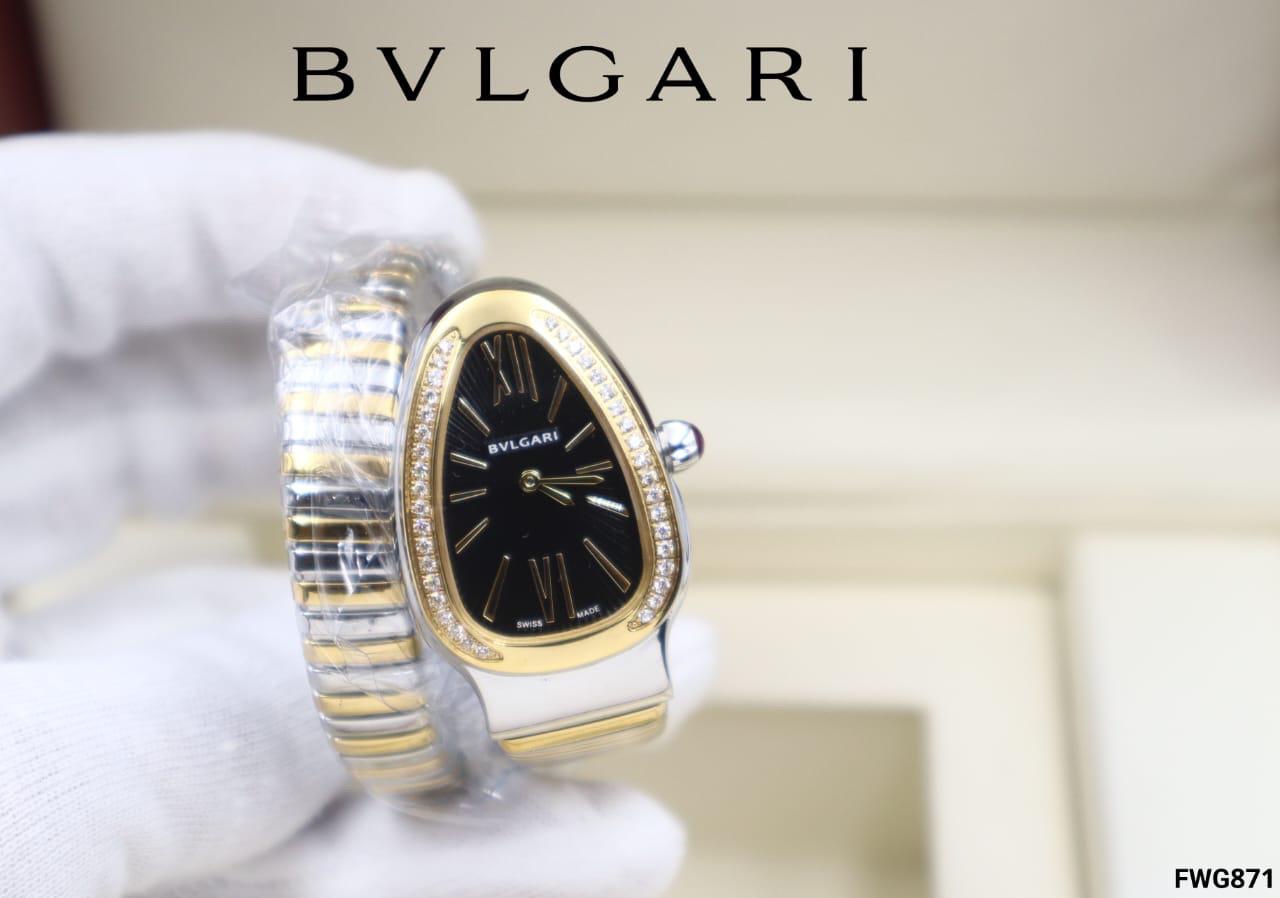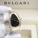 The Serpenti Tubogas watch by Bulgari, with a 33mm size, combines elegance and allure, reflecting the strength and beauty symbolized by its snake-inspired design. The strap is made from durable Stainless Steel 900 and features a distinctive shine that adds a touch of luxury. It is equipped with Sapphire glass that resists scratches and is also water-resistant, making it ideal for any occasion.