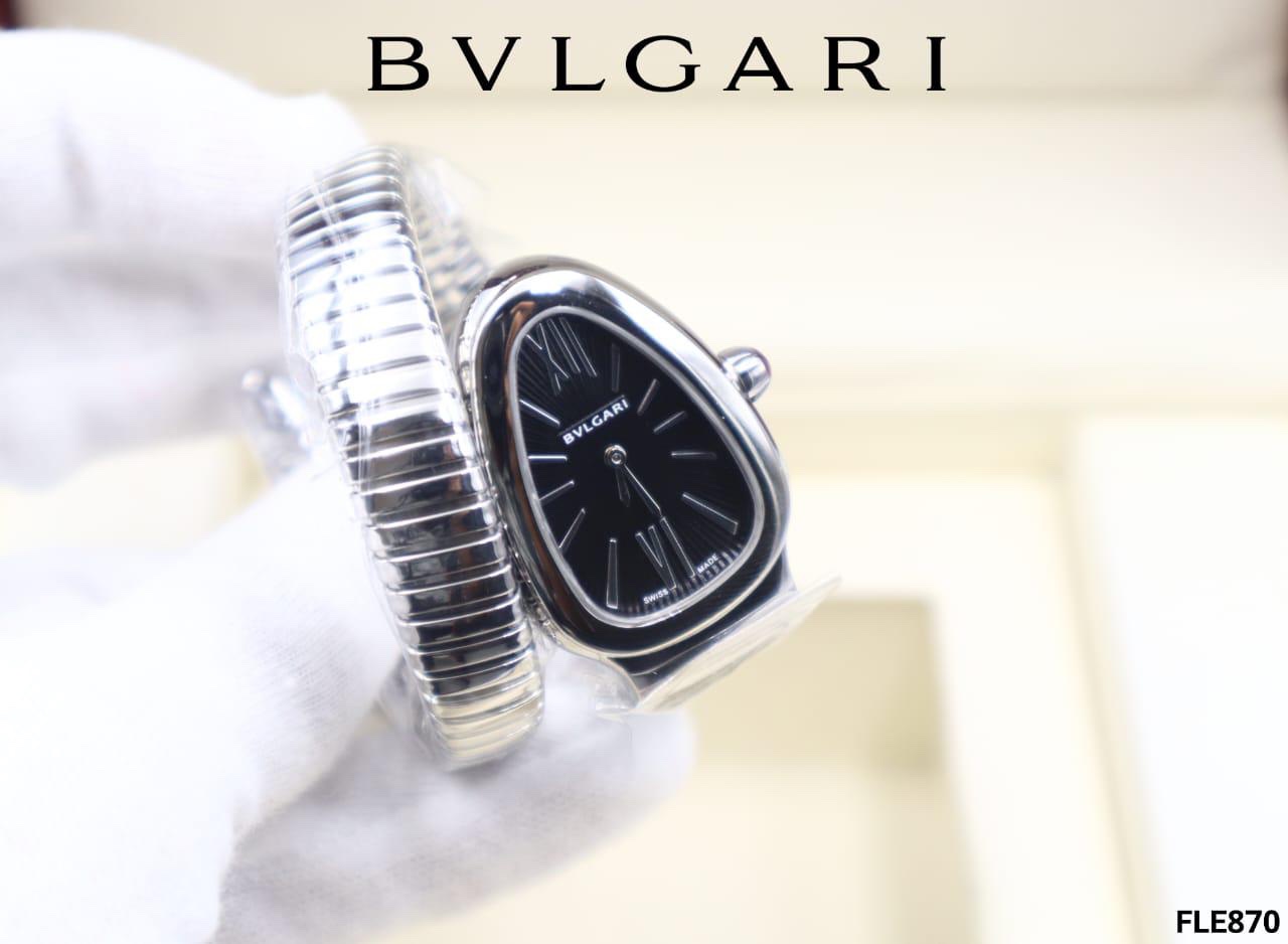 The Serpenti Tubogas watch by Bulgari, with a 33mm size, combines elegance and allure, reflecting the strength and beauty symbolized by its snake-inspired design. The strap is made from durable Stainless Steel 900 and features a distinctive shine that adds a touch of luxury. It is equipped with Sapphire glass that resists scratches and is also water-resistant, making it ideal for any occasion.