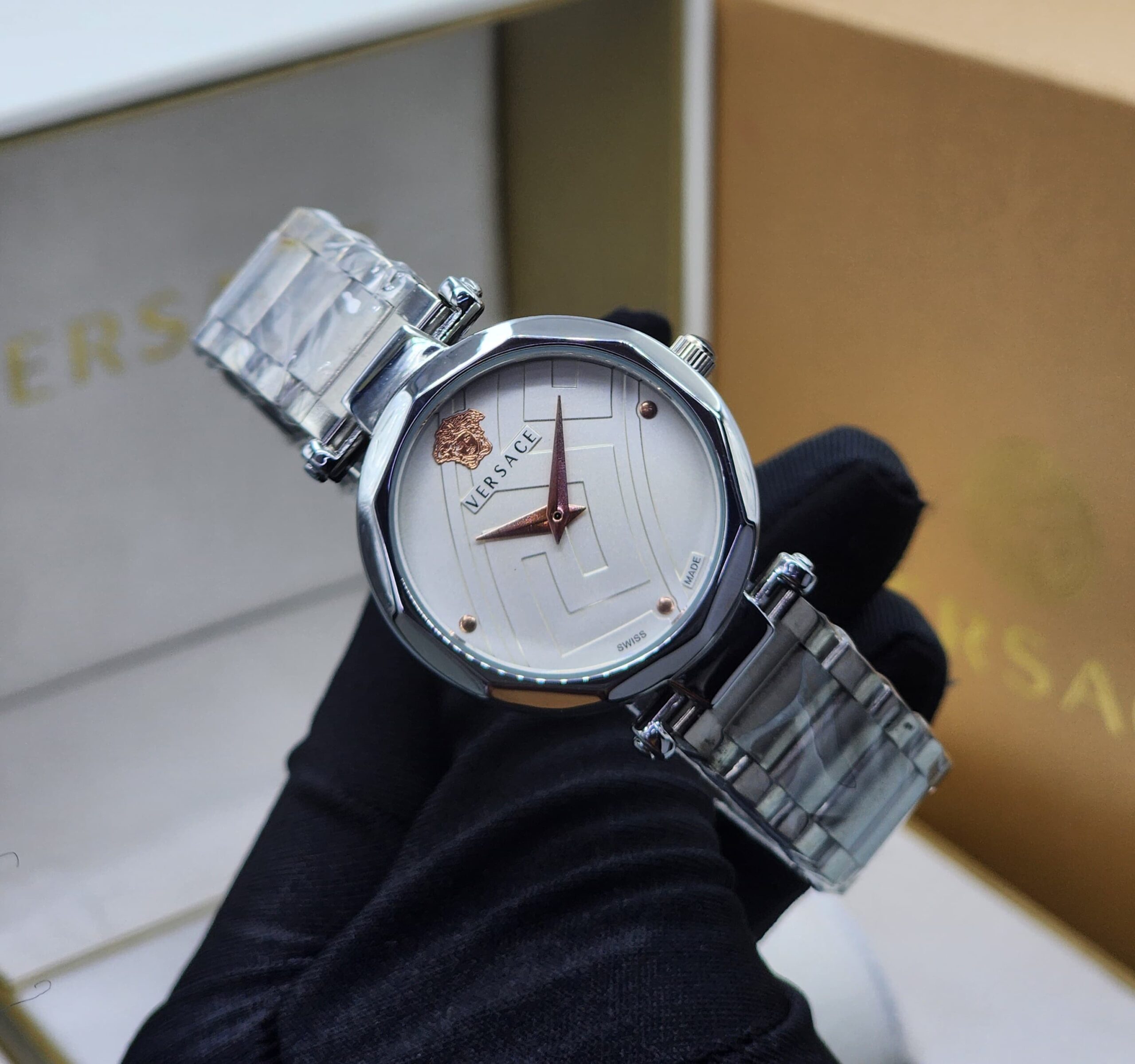 The 31mm Versace watch features an elegant and luxurious design, available in two stunning options: silver and gold. This watch boasts a dial adorned with the beautiful Versace logo, reflecting sophistication and uniqueness. Made from stainless steel, it is water-resistant, making it suitable for daily use while maintaining its allure. This watch is a high-quality replica, meticulously designed to offer a luxurious experience comparable to the original.